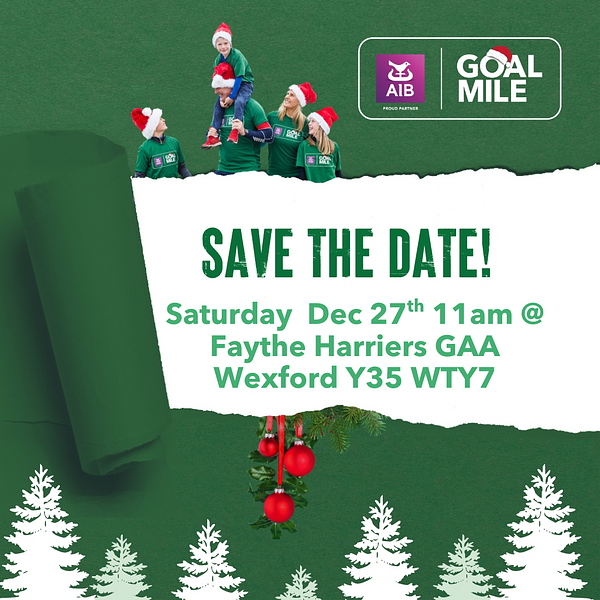 The GOAL Mile, proudly supported by AIB, is held throughout December and New Year's Day in villages, towns and cities across Ireland and virtually throughout the world. The event sees tens of thousands of people run or walk a mile to raise funds for GOAL. The Faythe Harriers are proud to host this event for the second time on the